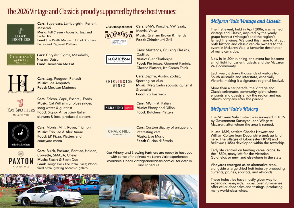 Momentum is building for the 2026 McLaren Vale Vintage and Classic, and we’re excited to release the official event flyer for this year’s celebration of cars, wine, food and community.